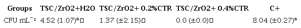 The results of the MDCT are represented in Table 3. Higher antibiofilm effectiveness was observed for TSC/ZrO2+CTR in the two concentrations in comparison with the positive control/C+ (p<0.05).