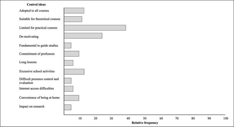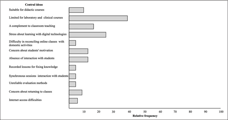 Professors considered distance learning suitable for didactical courses but a limited teaching method for lab and clinical courses. Therefore, they thought that it should be used only as a complement to classroom teaching. After an initial period of stress with digital technology applied in distance learning, professors considered that they had learned to use digital resources. However, the persistent difficulty was reconciling classes with domestic activities during social isolation (Table 1).