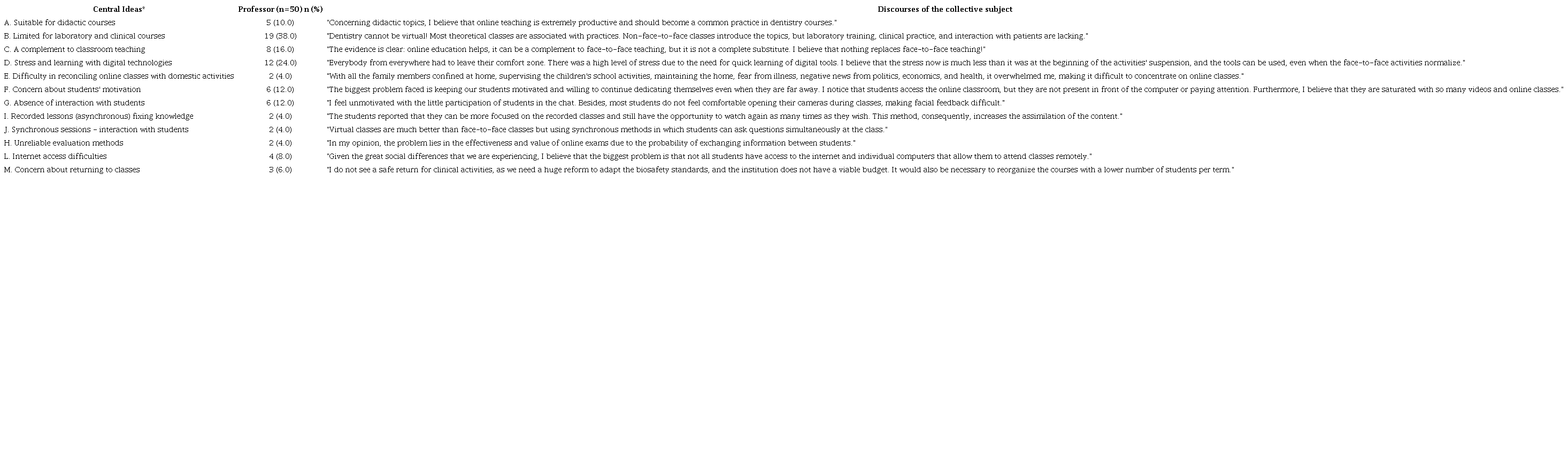 The participants' answers were transcribed and analyzed using the qualitative-quantitative method of the discourse of the collective (17,18) using the Qualiquantisoft software (SPI-Sales & Pascoal Company, São Paulo, Brazil). Initially, one researcher coded all the participants' answers. Two other researchers independently analyzed each group's answers, aiming to identify in more than one perspective the key expressions, that is, the most significant parts of the answers. The key expressions were then compared and synthesized into central ideas by consensus, which were identified by letters of the alphabet and distributed according to the absolute and relative frequency in which they were cited by the participants (17,18). Subsequently, the answers of participants with similar central ideas were grouped, obtaining the collective subject discourse (17,18), obtaining a version for professors (Table 1), and another for students (Table 2).