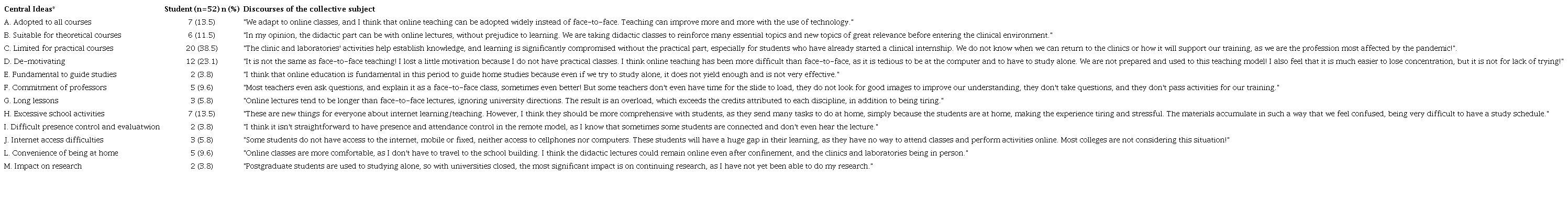 Some students reported optimism about distance learning and suggested that it should be used in all courses. However, in the same way as the professors, some students reported that distance learning could be applied only for theoretical classes. They considered it a limited teaching method for courses that depended on lab-based and clinical activities, and for that reason, they felt unmotivated. However, they considered distance learning fundamental to guide their studies during the period of social isolation, but this fact depended on the professors' commitment to classes (Table 2).