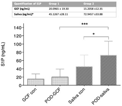 Elevated levels of S1P in GCF were detected in patients with POD (20,0965 ng/mL) compared to the control group (15,2058 ng/mL), however, no statistically significant difference was detected between the two groups. Elevated levels of S1P in saliva were found in control patients (72.9457 ng/ mL) compared to patients with POD (45.1267 ng/mL), with a statistical significance of p<0.05 (Figure 1).