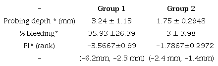 A total sample of 30 subjects reported no medical condition. The 66.66% (20 subjects) were women and the remaining 33.33% (10 subjects) were men, included in the 25-65 age range; also divided into Group 1 (cases) and Group 2 (controls). The average age for Group 1 was 48.86 years, while for Group 2 it was 41.53 years. The body mass index (BMI) in the case group was 28.28 and 27.18 in controls, which according to the World Health Organization (WHO) is classified as overweight (27). The periodontal characteristics of the study sample are described in Table 1.