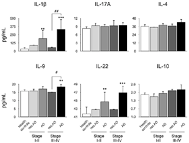 Also, we analyzed the secretion levels of IL-1β, IL-4, IL-9, IL-10, IL-17A, and IL-22 stratified by periodontitis stage and the presence or absence of AD (Figure 2). An increased was detected for IL-1β, IL-9, and IL-22 in patients with AD and periodontitis stage III-IV compared with healthy controls. Additionally, in patients with AD and periodontitis stage III-IV an increase in the secretion levels of IL-1β and IL-9 were detected when compared with AD patients affected with periodontitis stage I-II.