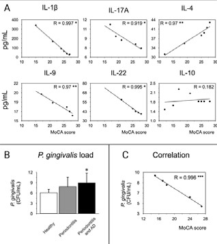 In addition, we evaluate the association between the P. gingivalis load and the IL-1β, IL-4, IL-9, IL-10, IL-17A, and IL-22 cytokines levels by the Pearson’s correlation. No correlation was detected among the different conditions.