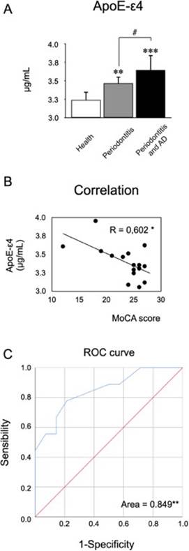 Firstly, we were able to quantify ApoE-ε4 in the GCF and detect differences. In both periodontitis patients with or without AD presented an increase in the secretion levels compared with healthy controls. Also, patients with periodontitis and AD produced more ApoE-ε4 than patients with periodontitis and not-AD. Secondly, we determine the association of the ApoE-ε4 levels with the MoCA scores by the Pearson’s correlation, detecting a negative correlation (Figure 4.B). Due there is no evidence in the literature of the detection of this molecule in GCF we decided to analyze the ROC curve (Figure 4.C). The area under the curve was higher than 0.8 suggesting that ApoE-ε4 detection in GFC of patients with different cognitive status could have a positive assessment.
