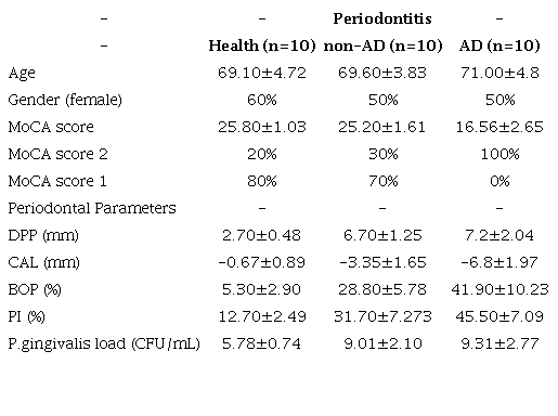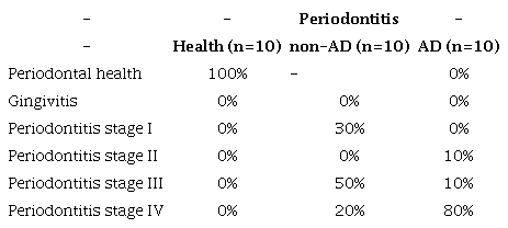 The recruited patients correspond to 10 patients with AD and 20 patients without AD. Of the 20 patients without AD or another type of dementia,10 were affected with periodontal disease and 10 were healthy subjects. Table 1 summarized the main epidemiological results of the selected patients. Briefly, patients with AD averaged 71±4.8 years, 50% corresponded to women. Patients with periodontitis and non-AD averaged 69.6±3.83 years, 50% corresponded to women and those in the control group average an age of 69.10±4.72 and 60% corresponded to women. In relation to the clinical parameters, patients with AD had higher DPP, more CAL loss, higher BOP and PI, compared to patients without AD affected by periodontitis or healthy subjects. Finally, when evaluating the MoCA test results, the patients affected with AD had an average of 16.56±2.65 corresponding to the 100% to stage 2. Patients non affected with AD had an average of 25.20±1.36, and the 70% was classified at stage 1, and 30% in stage 2. Besides, healthy controls MoCA score averaged 25.80±1.03, with 80% in stage 1 and 20%, stage 2. Also, the patients affected with AD, the 80% had periodontitis stage IV, 10% periodontitis stage III, and 10% periodontitis stage III. Patients without AD had 20% periodontitis stage IV, 50% periodontitis stage III, 30% periodontitis stage I (Table 2).