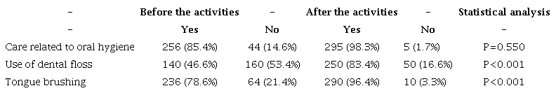Although there was no significant difference regarding oral hygiene care knowledge (Table 1), at the beginning of the study children reported having regular or good oral hygiene and, after motivation they reported good to excellent oral hygiene, according to brushing habits and dental flossing. Our results were similar to those of Markeviciute & Narbutaite (31) who when analyzing orphaned children after oral hygiene motivation, observed a significant improvement in tooth brushing frequency.