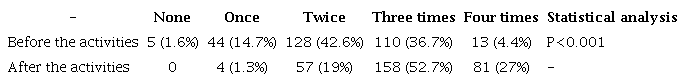 Table 2 shows the daily toothbrushing frequency before and after participating in the project activities. The data are presented as percentages and total values.