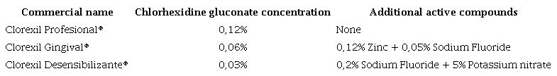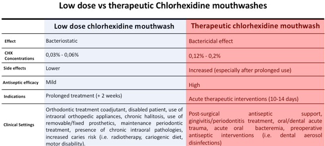 Mouthwashes containing CHX have been reported to be effective in oral hygiene regimens, as adjuvant in the management of gingivitis, periodontitis and peri-implant disease. Dental plaque is the etiological factor of gingivitis and periodontitis. Mouthwashes are an ideal vehicle to incorporate agents such as CHX that has demonstrated to have a positive effect preventing plaque accumulation and gingival inflammation (3). Commercially, these therapeutic agents are available in wide range of concentrations, or combined with secondary agents to enhance its clinical effect. In general, chlorhexidine mouthwashes can be classified as bactericidal or therapeutic when concentrations above 0,12% are used, or low-dose concentration mouthwashes for more diluted presentations (1). Figure 1 summarize some of the particular characteristics and indications (Figure 1.)