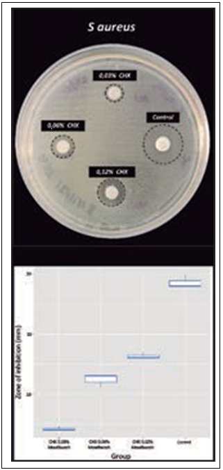 The anti-staphylococcal activity of CHX mouthwashes at concentrations of 0.2% and 0.12% had been observed previously in other studies (30, 31, 32, 33). In the present investigation, all the mouthwashes inhibited S. aureus growth in vitro. The three different concentrations showed an inhibition zone proportional to the concentration of CHX. Our results suggest that lower doses of CHX are useful as part of decontamination regimens to decolonize presence of staphylococcal activity in the oral cavity and oropharynx. Isolates of S. aureus have been obtained in subgingival and supragingival plaque of patients with periodontitis and/or periimplantitis. This is relevant, since the reduction in the number of S. aureus in the oral cavity, prior to surgical procedures, has been associated with a lower incidence of infective endocarditis and postoperative complications (32) in patients with respiratory infections.