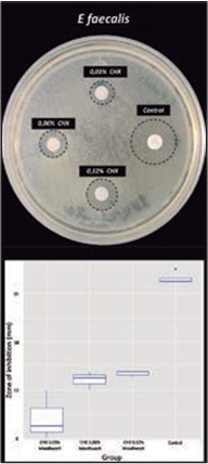 Enterococcus faecalis ATCC® 29212™ (E. faecalis) group showed significant statistical differences between the inhibition zones of all samples (F=73,54; p<0,001) (Figure 3). Multiple comparison was evaluated with a Tukey post hoc test, showing that the antibiotic inhibition zone of the antibiotic disc showed statistically significant differences (p<0.001). Mouthwashes containing 0,12% and 0,06% CHX didn’t showed significant statistical differences, but both groups were diffe- rent than the 0,03% CHX mouthwash.