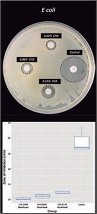 E. coli is a gram-negative bacteria, commonly found in the gut of humans, and most strains do not cause human disease. However, some strains produce toxins and other virulence factors, such as lipopolysaccharide, that may produce food poisoning if people swallow E. coli by eating contaminated foods, by drinking contaminated water, or by hand to mouth contact. The presence of E. coli has also been reported in subgingival biofilm of patients with periodontitis, and a significant higher prevalence was observed in diseased sites of periodontal patients compared to perio- dontally healthy subjects (38). Case reports and in vitro studies have associated gram-negative enteric rods to early dental implant failure and peri-implantitis (39,40,41). Our results indicate that the three concentrations of CHX mouthwas- hes displayed a similar inhibition zone to E. coli. It has to be considered that only a single strain of E. coli was used in this experiment. Therefore, this may pose a limitation in the interpretation of the results since there can be great genetic variation with different strains of the same specie.