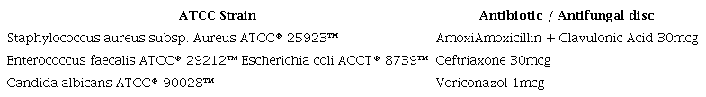 The experimental method selected was the Kirby-Bauer method to evaluate the antibacterial effect of each compound by measuring the inhibi tory effect of the bacteria or fungal strain exposed to the antiseptic solution. This method was emplo yed selecting 4 different strains of ATCC cultures. Table 2 summarize the strains and the antibiotic or antifungal agent used as control.