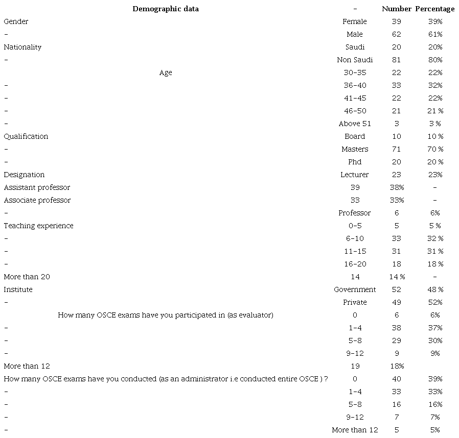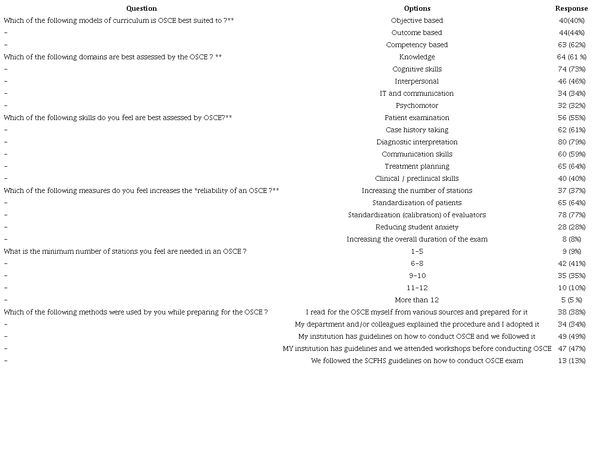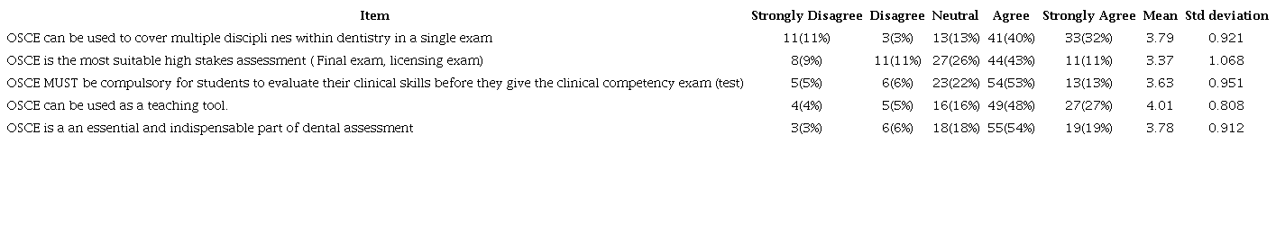 The current study collected responses from private and government dental colleges in the kingdom. The results from the study may thus be considered to be fairly representative of the opinions from a diverse population. With more than 60% of the faculty having experience ranging from 6-15 years, their opinions may be considered to represent a more contemporary thought process regarding the OSCE. Only 6 respondents( approx. 6%) had never participated in the OSCE and a significant number (60%) were OSCE administrators. Together data suggests that, OSCE appears to be an assessment tool utilized frequently in dental education, with robust faculty participation.