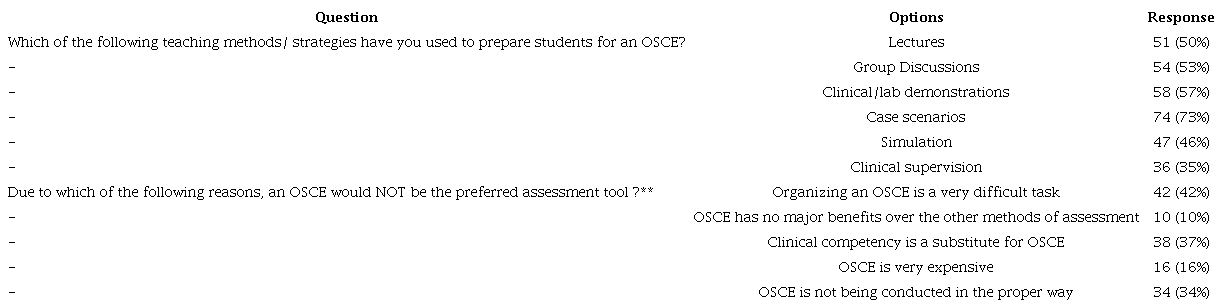 Responses indicate that faculty believed OSCE is a flexible tool, capable of assessing students in diverse models of curriculum including objective, outcome or competency based. Moreover, the highest percentage of responses indicated suitability in competency based curriculum. A comparison with written exam showed that OSCE resulted in an increased proficiency in the tested clinical competence (8). Indeed, OSCE has been deemed to be “a valuable mechanism to assess curriculum, not only for the content but also its effectiveness”(9). A well designed OSCE is believed to be a precursor to the development of competency based curriculum since it plays an important role in the evaluation process (10). Responses from faculty appears to corroborate the findings from previous studies.