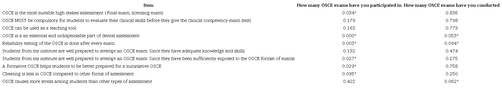 Male respondents were higher than the females and largest population of respondents were between the age group of 36-40 (32%). Table 1 shows that Master’s degree was the highest (71%) with the subgroup of respondents with designation of assistant professor (38%) and experience of 6-10 years(32%). The responses were evenly distributed between government (48%) and private (52%) institutes. Most faculty had participated in 1-4 OSCE’s (37%), but the highest number of them (39%) had never been administrators for OSCE. Table 2 shows the faculty responses regarding knowledge and practices and observations (n=6) with multiple options. Table 3A and Table 4B are about the details of Faculty practices and observations towards OSCE evaluated using multiple choice questions and 5 point likert scale which are expressed as number and percentage of responses. Faculty attitude towards OSCE evaluated on a 5 point Likert scale are detailed in Table 5. Association between select responses showed significant correlation OSCE experience and utility of OSCE in dental assessment and reliability testing being done after every exam is explained in Table 6.