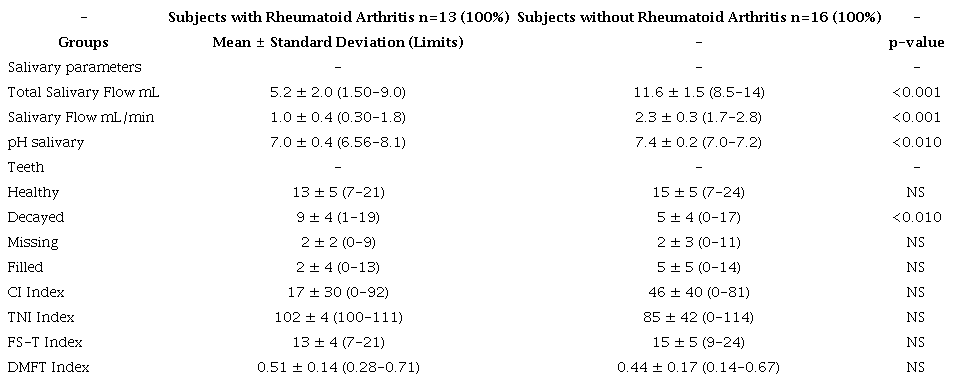 Authors have reported that the presence of dental caries is associated with the quality of life of patients (37,38). We observed alterations in the different parameters of saliva and a high frequency of dental caries in subjects with newly diagnosed rheumatoid arthritis compared with a control group, the previous results could be related to the association between subjects with chronic rheumatoid arthritis and tooth loss. Therefore, it is necessary to carry out studies and multivariate analysis to identify associations.