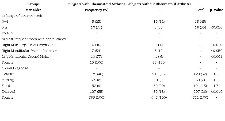 a) 100% (n=13) of the subjects with rheumatoid arthritis had caries (p=0.0045); b) 38% of the subjects presented between 11-15 (range) caries (p=0.0341); and c) the most frequent teeth with caries were: 1. the right maxillary second premolar (n=6,46%, p=0.0100); 2. ight mandibular second premolar (n=7,54%, p=0.0462) and 3.left mandibular second molar (n=10, 77%, p=0.0001).