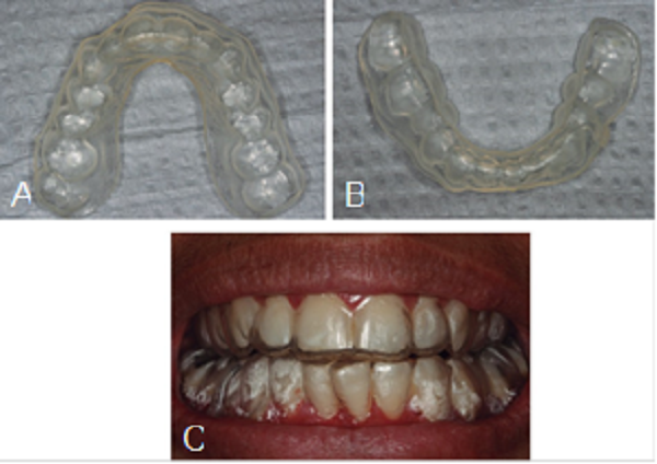 Para el tratamiento, previo se solicitaron exámenes de laboratorio incluyendo hemograma completo, función renal y hepática, los cuales presentaron valores dentro de límites normales. Se trató con propinado de clobetasol 0.05% en orobase colocado en fundas flexibles para llevar a boca durante 5 minutos, tres veces al día (Figura 2), a diario enjuague por la noche con 5ml de nistatina 100.000 UI/cc para prevenir sobreinfección micótica, la paciente inició su tratamiento asistiendo cada semana a control.