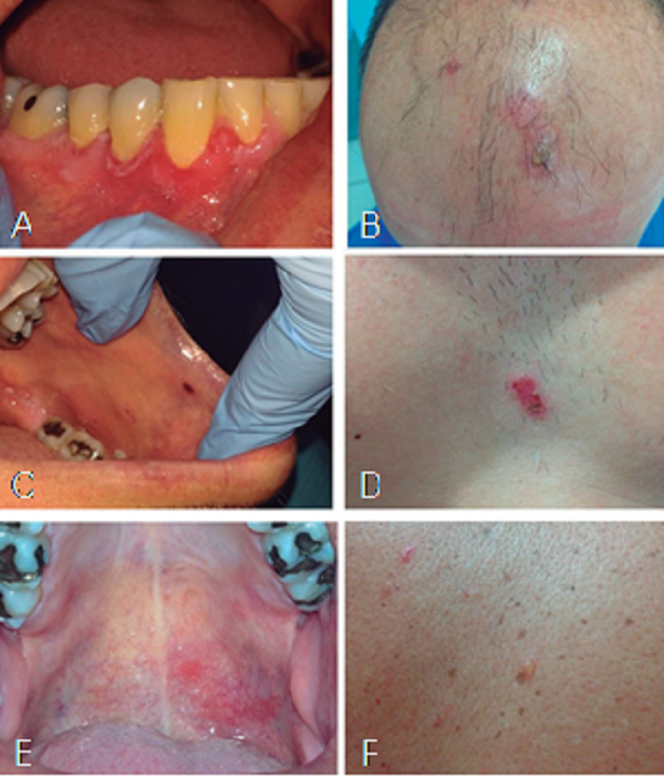 Su presencia en la mucosa oral es común, y en cerca del 54% de los casos, la cavidad oral ha sido reportada como el sitio primario de su desarrollo (9). Las lesiones orales incluyendo las lesiones gingivales, pueden preceder las lesiones cutáneas (10).