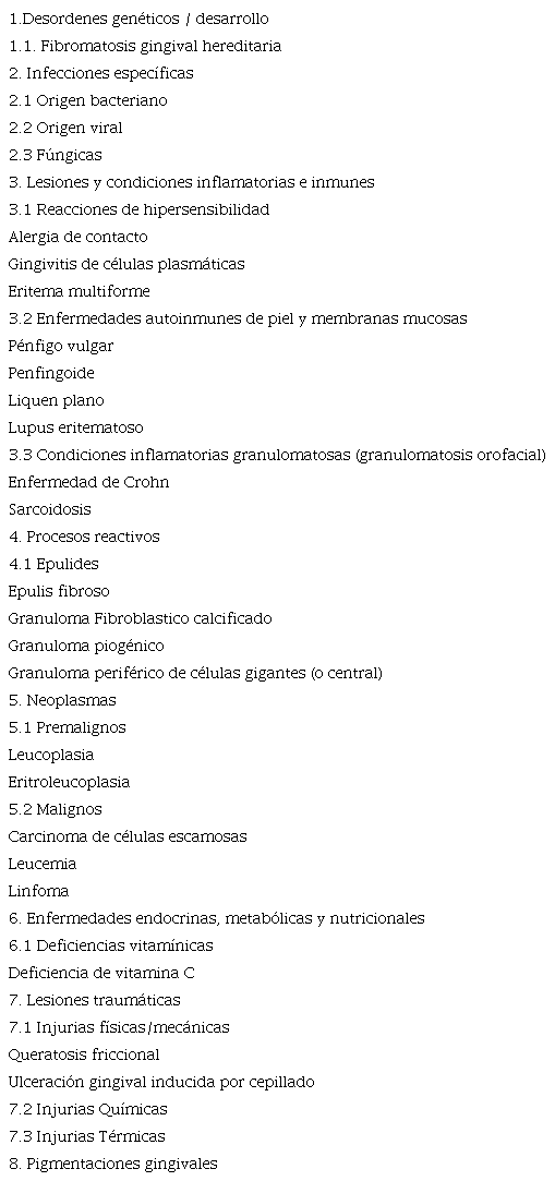 La gíngiva como otros tejidos orales puede presentar diferentes lesiones patológicas no inducidas por placa bacteriana, que en algunas circunstancias pueden ser manifestaciones de condiciones sistémicas o desordenes médicos, o solamente pueden representar cambios patológicos limitados a los tejidos gingivales. A pesar de que estas lesiones no están directamente causadas por la placa bacteriana, su curso clínico puede estar exacerbado por esta, con la subsecuente inflamación gingival. El World Workshop del 2017 de la Academia Americana de Periodoncia y de la Federación Europea de Periodoncia presentó una clasificación contemporánea de las relevantes condiciones y enfermedades gingivales no inducidas por placa bacteriana (1) (Tabla 1).