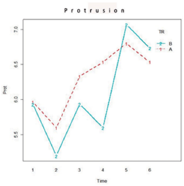 The mean found for protrusion in experimental group was 5.96mm at the first appointment with a 95% CI of 4.70 to 7.22mm, at the last appointment a mean of 6.53mm with a 95% CI of 5.35 to 7.71mm was presented. In the control group at the first appointment, the mean was 5.93mm with a 95% CI of 4.85 to 7.01mm. At the last appointment, a mean of 6.73mm was presented with a 95% CI of 5.74 to 7.72mm (Figure 3).