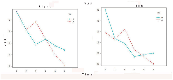 For the evaluation of the right joint capsule by VAS, 43.60mm was obtained in experimental group at the first appointment with a 95% CI of 26.93 to 60.27mm, at the last appointment a mean of 20.47mm was presented with a 95% CI of 9.18 to 31.75mm. In control group, at the first appointment, the mean was 43.53mm with a 95% CI from 30.16 to 56.90mm, at the last appointment a mean of 27.07mm with a 95% CI from 11.77 to 42.36 was presented. For the evaluation of the left joint capsule using VAS in experimental group it was 34.60mm at the first appointment with a 95% CI of 20.10 to 49.09mm, at the last appointment a mean of 20.20mm with a 95% CI of 8.95 to 31.45mm was presented. In control group at the first appointment, the mean was 45.13mm with a 95% CI of 29.33 to 60.93 mm, at the last appointment a mean of 25.07mm was presented with a 95% CI of 13.31 to 36.82 mm (Figure 4).