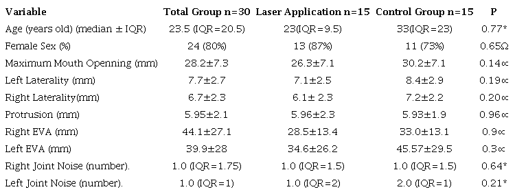 Among the 30 patients that were selected, 28 finished the treatment, two of them were lost to follow-up (appointment 6) of the experimental group. All patients had signs and symptoms of the arthrogenic group. The gender distribution of DTM was 20 women (80%) and 6 men (20%). The most frequent age in which DTM occurs was in the 20 to 30 years old interval with 10 patients (33.3%) with a mean of the 2 groups of 30.80 years old.