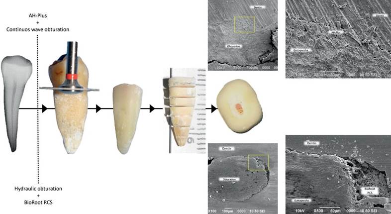 Intact freshly extracted single-rooted maxillary and mandibular premolars were stored at 4°C in saline solution (supplemented with 100 U/mL penicillin, 100 mg/mL streptomycin, and 0.25 mg/mL amphotericin B). A 10 K-file (Dentsply Maillefer, Switzerland) was used to ensure apical patency by visualizing the 10 K-file tips at the root apex and to measure the working length. When apical patency was not attained, a tooth had an open apex or presented more than one canal the tooth was excluded. A total of 30 teeth were selected and K-files of increasing diameter were used to measure the apical diameter at the working length before instrumentation. Root canals were prepared using Protaper Next (Dentsply Maillefer, Switzerland) rotatory system with an endodontic motor with adaptive motion (SybronEndo Elements, USA). The instrumental sequence was as follows: File X1 (size 17, .04 taper), X2 (size 25, .06 taper) and X3 (size 30, .07 taper); using constant irrigation with a 2.5% of sodium hypochlorite solution. Teeth were randomly assigned in 2 experimental groups (n=15) using CWC with AH-Plus + or single cone HO with BioRoot RCS. After obturation, the crowns were removed at the cement-enamel junction using a diamond disk under cold water (Figure 1). Cross-sections of the roots (2mm) were obtained and only 4 sections from the central area of each root were selected. A total of 60 cross-sections were used per group. The specimens were sterilized under ultraviolet light for 15min, and stored for 24h in a 100% humidity incubator at 37°C to allow the setting of the root filling materials. BioRoot RCS and AH-Plus were freshly prepared for each tooth according to manufacturers’ instructions.