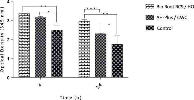 According to the established time intervals, the cell adhesion response of hPDL cells seeded onto tooth slices was analyzed by crystal violet assay (Figure 2). The results showed that more cells adhered to the root slices obturated with BioRoot RCS/HO than on the slices with AH-Plus/CWC. Both groups of treated root slices showed higher adhesion when compared to control after 4 and 24h of cell culture, with an increase response to the BioRoot RCS/HO group (p<0.05). The result suggests that the obturation technique contributes significantly to the attachment of hPDL cells, and the fluorescence staining supported the results regarding cell adhesion.