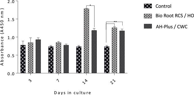 Noteworthily, cell proliferation was higher in the experimental groups than in the controls after day seven. The available literature stated that all root canal sealers' toxicity reduces with time, regardless of the type of cement, and eventually, the sealers become an inert material (20,23,24,25). Most cytotoxicity studies performed with sealers have been carried out directly on the tabled-shaped material, which generally led to more significant limitations by not emulating its clinical use (25). In the present study, the manufacturer’s protocol was followed, and the sealers were employed following the same parameters used in clinical practice. As seen in our results, the BioRoot RCS/HO group induced a faster proliferative response than the other groups.
