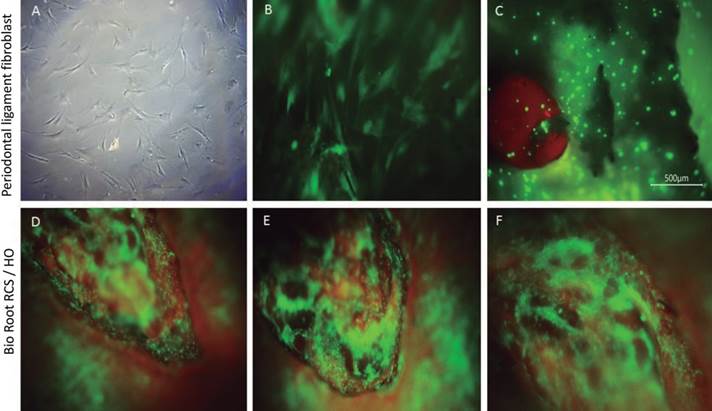 Fluorescence analysis was performed to determine whether cells’ growth, attachment, interaction with the material, and morphology. The fluorescence analysis showed that hPDL cells adhered and grew on the surface of the root model. The hPDL cells adhered to the root slices filled with BioRoot RCS/HO uniformly and covered all the slice surface showing a positive staining represented by a green apple color, and this was interpreted as adequate viability of the cells. The cells maintained a large, flat, elongated and spindle-shaped morphology, as shown in the fluorescence microphotographs (Figure 4).