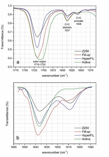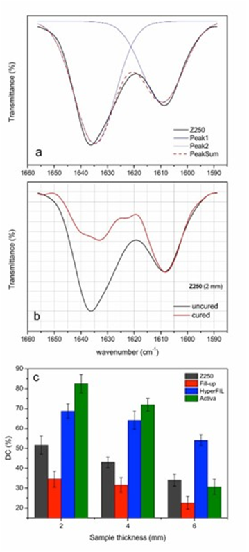 Figure 1.a and Figure 1.b show the FTIR spectra of the uncured composites in the wavenumber range of 1,550-1,775 cm-¹ and the C=C double-bond region (1,590-1,660 cm-¹), respec- tively. Figure 2.a shows the peaks of aliphatic and aromatic C=C bonds in an uncured representative sample (Filtek Z250). The FTIR transmittance spectrum of samples was deconvoluted into two peaks by a Lorentzian function after performing a linear baseline correction in a wavenumber range of 1,590-1,660 cm-¹. Areas of 1,608 cm-¹ and 1,637 cm-¹ peaks were determined with the peak deconvolution operation using OriginPro 8.0 software. A change in peak intensity at 1,637 cm-¹ due to crosslinking is illustrated in Figure 2.b. Figure 2.c compares the calculated DC% values of the samples as a function of sample thickness. It was found that the DC% values decreased in the order of ACTIVA>HyperFIL>Filtek Z250>Fill-Up for sample thicknesses of 2mm and 4mm. For the 6 mm-thick samples, this order was HyperFIL>Filtek Z250≥ACTIVA>Fill-Up.