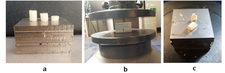 Figure 3.a, Figure 3.b, and Figure 3.c show examples of test specimens at different thicknesses, compression testing devices, and fractured specimens, respectively. There was no statistically significant difference between the CS values of each material at different thicknesses (p>0.05). No difference was found between the materials with a 2-mm thickness. The highest CS values were observed in the Filtek Z250 group, with values of 278.4±38.4, 271.2±50.4, and 269.2±36.3 for the 2-, 4-, and 6-mm thick samples, respectively.