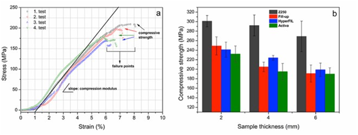 Figure 4.a shows representative stress- strain (SS) curves of a composite sample. The average CS values and standard deviations for each sample series at different thicknesses are listed in Table 3. In the column graph shown in Figure 4.b, the CS values of the samples are compared as a function of composite type and sample thickness. The mechanical parameters of the samples are also listed in Table 3.