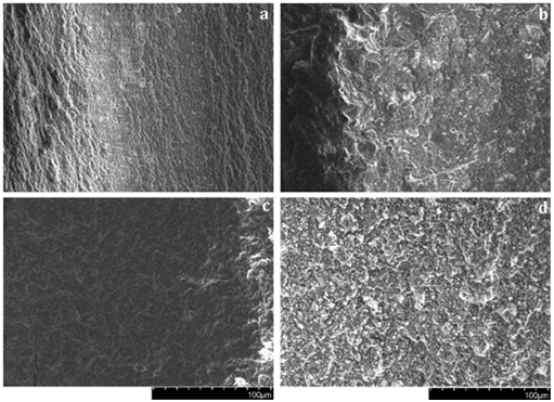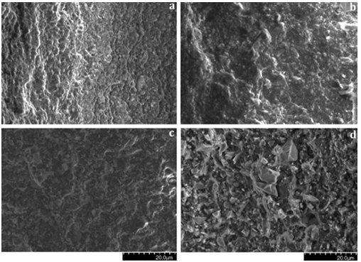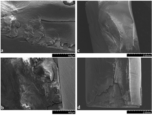 SEM micrographs of representative composite samples imaged at magnifications of 1,500× and 5,000× are shown in Figure 5 and Figure 6, respectively. These images were taken at the fractured surfaces of the samples. Figure 7 shows fractured regions of the tested composites. As seen in Figure 5, inorganic components are distributed well into the resin matrix in all of the composites. The higher magnification images shown in Figure 6 imply that there are no holes or voids around the particles. Figure 6d indicates that the average particle size of the ACTIVA composite is larger than that of the other composites. Figure 7.a, Figure 7.b, and Figure 7.c compare fractured regions of the Filtek Z250 composite at different thicknesses, and the images taken at a lower magnification were used to determine the failure mechanism of the composites. Figure 7.d shows the fracture lines that appeared in the 6-mm thickness ACTIVA sample. Vertical and deep cracks that fragmented the specimen into several big pieces are clearly seen in this image.