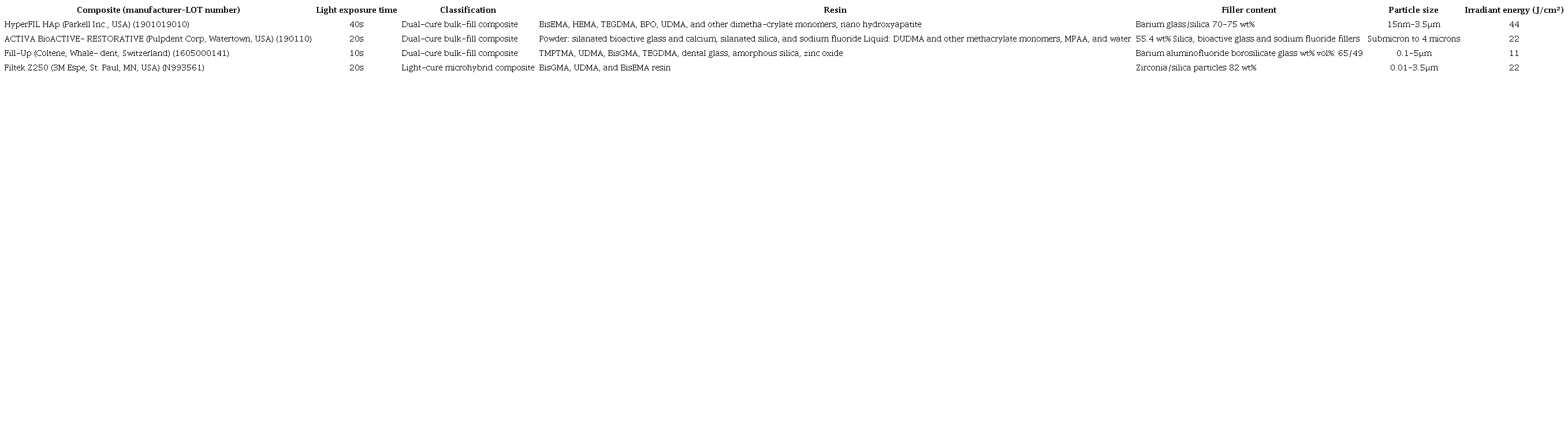 In this study, four commercially available dental restorative materials were evaluated. A conventional RBC was used as the control material (Filtek Z250, 3M ESPE, St. Paul, MN). The following three dual-cure bulk-fill composite materials were used as the test materials: a flowable dual-cure bulk-fill composite (Fill-Up, Coltène/Whaledent AG, Altstätten, Switzerland), a bioactive flowable dual-cure bulk-fill composite (ACTIVA BioActive Restorative, Pulpdent Corp., Watertown, MA), and a low-viscosity dual-cure bulk-fill composite (HyperFIL HAp, Parkell Inc., New York, USA). The chemical compositions and lot numbers of the composites, as well as the particle sizes of their inorganic components, are shown in Table 1, and the information is based on the data sheets provided by the manufacturers.