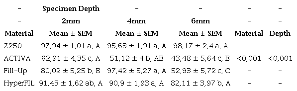 Sideridou et al. (34) reported that the DC of light-cured dimethacrylate-containing RBCs was affected by their chemical components, and that the DC increased in the order of Bis-GMA<Bis- EMA<UDMA<TEGDMA. However, the ratio of filler amount to resin is also important for polymerization. As the amount of filler increases, it becomes more difficult for the composite to polymerize (35). Increasing the amount of filler prevents polymeric chain propagation (36) and reduces the mobility of Bis-GMA due to its high viscosity (34). Hence, in our study, the finding that ACTIVA showed the highest DC% at thicknesses of 2 and 4mm (Figure 2) can be attributed to it containing a low amount of filler.