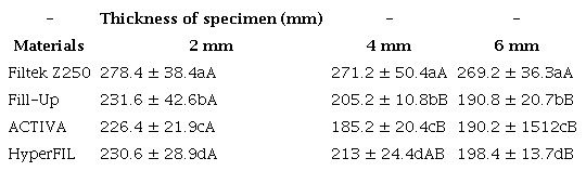 The bottom/top VHN values of the materials are presented in Table 2. At a thickness of 6mm, Filtek Z250 showed the highest bottom/top VHN value (98.17±2.4) compared to the other groups.