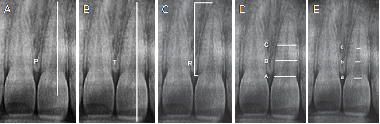 The measurements of the upper central incisors in digital panoramic radiographs were made using the EasyDent V4 Simple Viewer program (software of the Vatech Pax-I series digital panoramic X-ray equipment) the following measurements were obtained: (Figure 1. A-E).