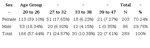The sample was distributed according to sex (female and male) showing that 70.24% (203) were females while 29.76% (86) were males and the age group with the highest frequency of cases was 20 to 26 years (Table 1).