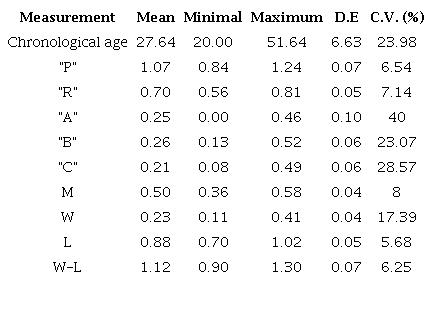 The radio of measurement proposed by Kvaal's method were analyzed, where the highest mean was W-L with 1.12 years, while the radius with the lowest mean was "C" with 0.21 years. The average age of the sample was 27.64 years with a variability of 23.98% with respect to this average, indicating a relative homogeneity. When observing the variation of the measurement radio, homogeneity was found in the radio of: P (6.54%), R (7.14%), M (8%), L (5.68%), W-L (6.25%), as for those with relative homogeneity were: B (23.07%), C (28.57%), W (17.39%) and the most heterogeneous with respect to the sample was A (40%) (Table 2).