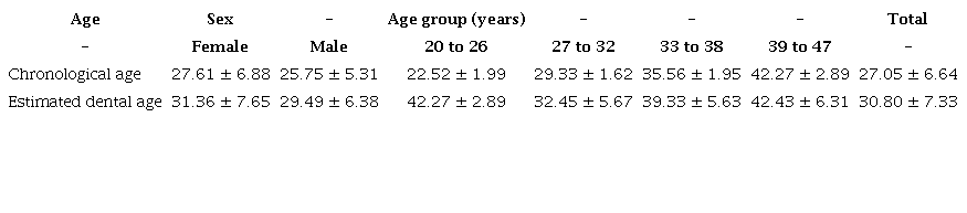 Each of the estimated dental age and chronological age variables for each age group have a significant normal probability behavior, for which the Kolgomorov Smirnof test was used. The correlation between the chronological ages and the estimated dental ages for each age group showed high correlations (27 to 32 years and 39 to 47 years), but when the correlation was made by age group, it was found to have a low correlation. The confidence intervals for the total sample calculating the average of the chronological age, the estimated dental age, the total average and for the different age groups have negative lower and upper limits, which implies that the estimated dental age is greater than the chronological age on average. As for the significance for the difference between the averages between the chronological age and the estimated dental age, all are significant with the exception of the age group 39 to 47 years. The t-test was performed for related tests in order to find the precisión between the chronological age and the estimated age according to the Kvaal method, where found that the total sample achieved a mean of -3.160 with 95% confidence intervals (-3.78 to -2.53), which indicates that the precision of the method is 1.24 (Table 5).