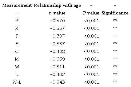 Pearson's correlation showed that the radii with the highest level of significance were: M with a value of r-0.659, W with a value of r-0.511 and W-L with a value of r-0.643. Chronological age has a higher linear correlation with the variables M and W-L, but the correlations between measu- rement radii and chronological age are all significant (Table 4).