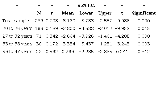 When the correlation coefficient was obtained by performing the t-test for paired tests between age groups, it was observed that the results were low, while the correlation for the total sample obtained a high value of r: 0.708, there- fore, there is greater precision when the entire sample is studied together.