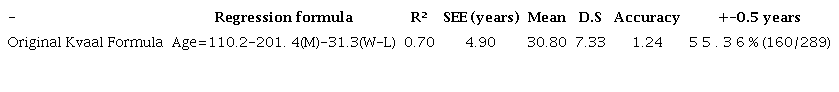 When obtaining the standard error of the estimation in years of the original Kvaal formula was 4.90 years, with a coefficient of determination of 0.70, a precision of 1.24 and a percentage of accuracy of 55.36% (Table 6).