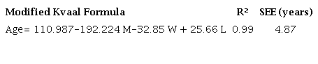 Due to the factors presented above, different studies have presented modified Kvaal formulas to be applied to their type of population in order to better evaluate the accuracy of the method when estimating dental age with chronological age (1,15).