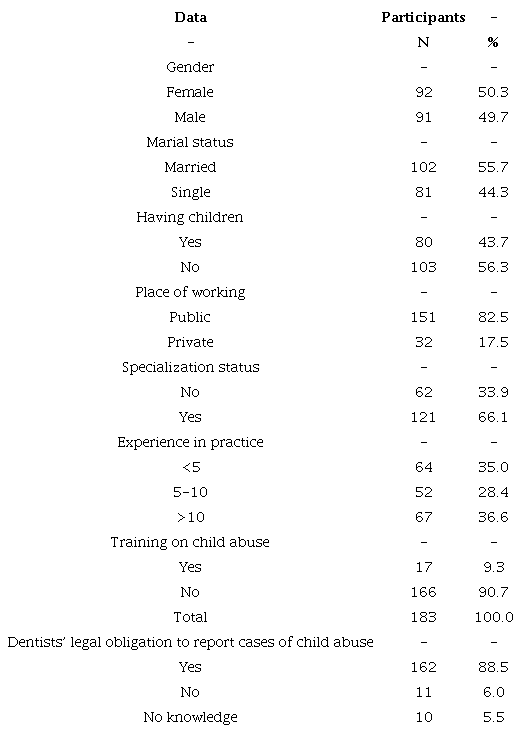 As for the procedures to be followed when child abuse is suspected, 23 participants (12.6%) did not know whether their institution provided these procedures. Whereas the institution of 29 participants (15.8%) provided such procedures and that of 131 participants (71.6%) did not. Dentists who were married (76 participants, 74.5%) mostly stated that their institution did not provide the procedures (p=0.025).