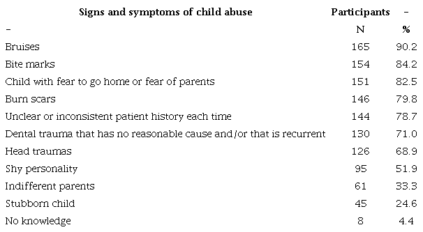 As in other studies (5,9,10), bruises on the skin were pointed out as the most common symptom of abuse and other symptoms were found in similar frequency. However, it should not be ignored that bruises may occur due to accidents and systemic diseases, and the location, size, shape, color of the bruise, and age and activity status of the child should be carefully evaluated in terms of diagnosis (25). Only 4.4% of the dentists in this study stated that they had no knowledge about the symptoms of child abuse; shy personality, indifferent parents, and stubborn child were reported to a lesser extent as signs of abuse. That the dentists who were long-time experienced, married and had children did not know the symptoms or all the symptoms of child abuse suggests that information was forgot- ten over time, was not up to date, or these dentists did not keep up with technological developments. Living conditions and responsibilities becoming more challenging with age might be an explanation for this.