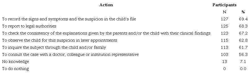 Only 12 participants (6.6%) stated that they have ever suspected a case of child abuse once or twice throughout their professional lives and never found out if their suspicions were to be confirmed or not. Of the 12 participants; 7 (58.3%) inquired the subject through the child and/or family, 6 (50.0%) recorded signs and symptoms and their suspicion in the child’s file, 8 (66.7%) observed the child for this suspicion in later appointments and 6 (50.0%) checked the consistency of the explanations given by the parents and/or the child with their clinical findings. In cases where child abuse was suspected, dentists in private practice (6 participants, 100.0%) mostly inquired the subject through the child and/or family (p=0.003) and female dentists (7 participants, 87.5%) mostly followed up and observed the child in later appointments (p=0.030).